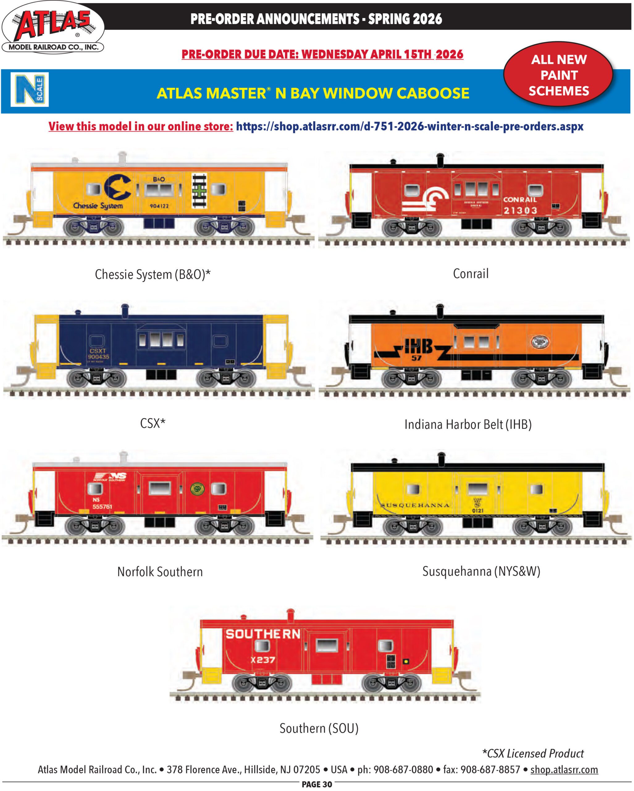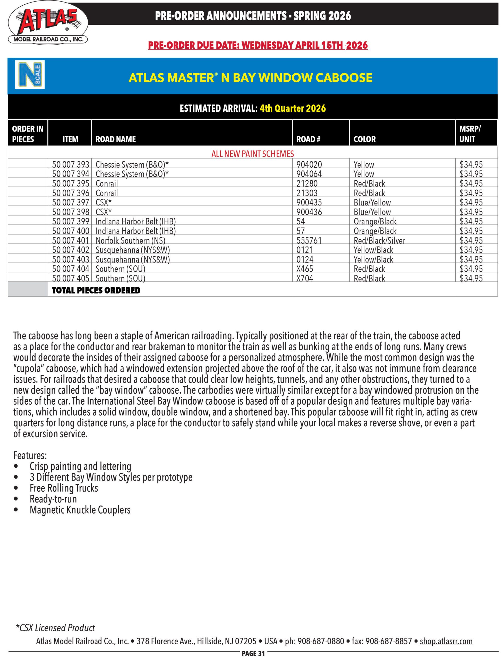 Atlas Master Bay Window Caboose Order Now Place Your Pre-Order Here * indicates required field Name:* Email:* Address:* City:* State:* Zip Code:* Phone Number:* Item Name & Manufacture:* Item Number(s) and Quantity:*