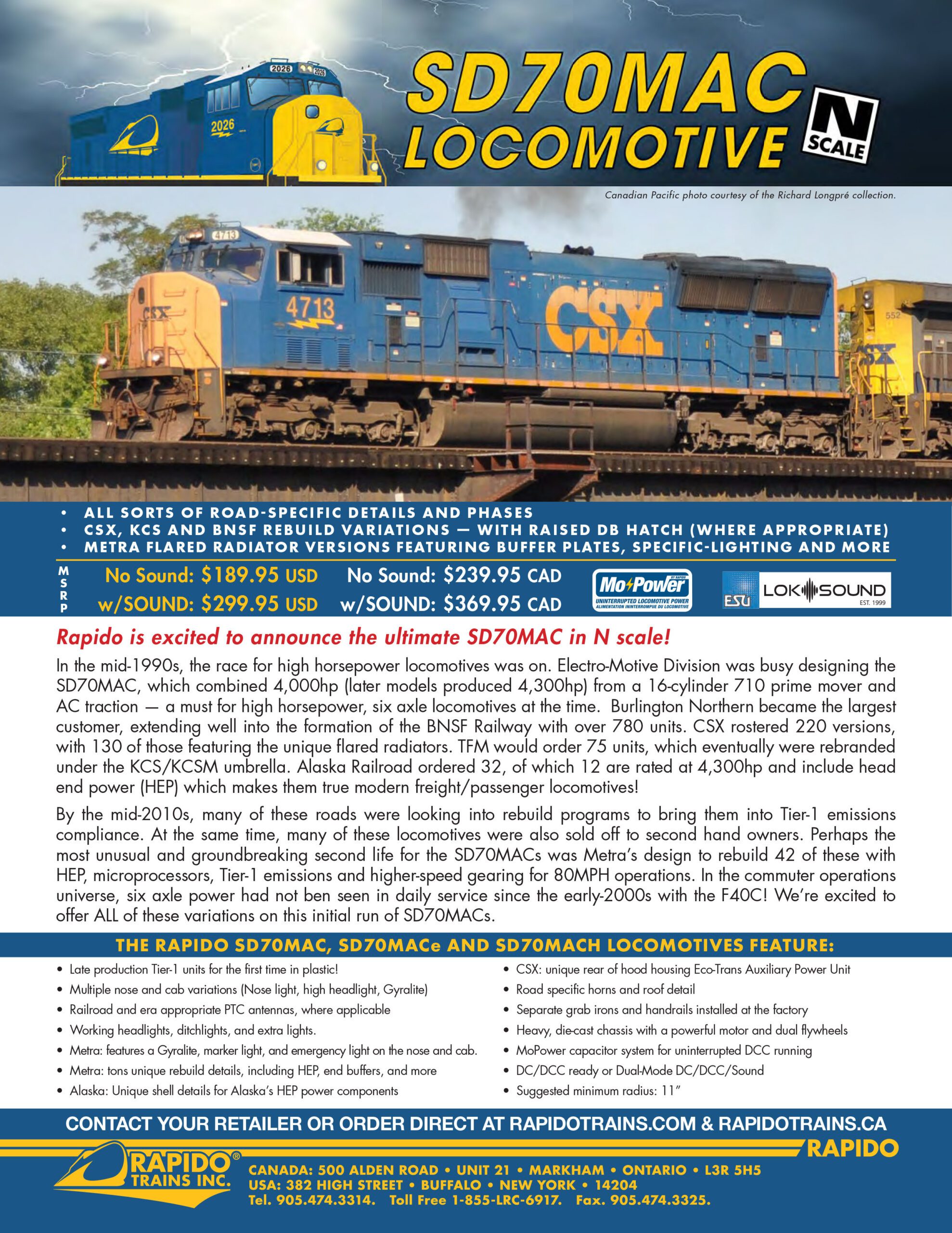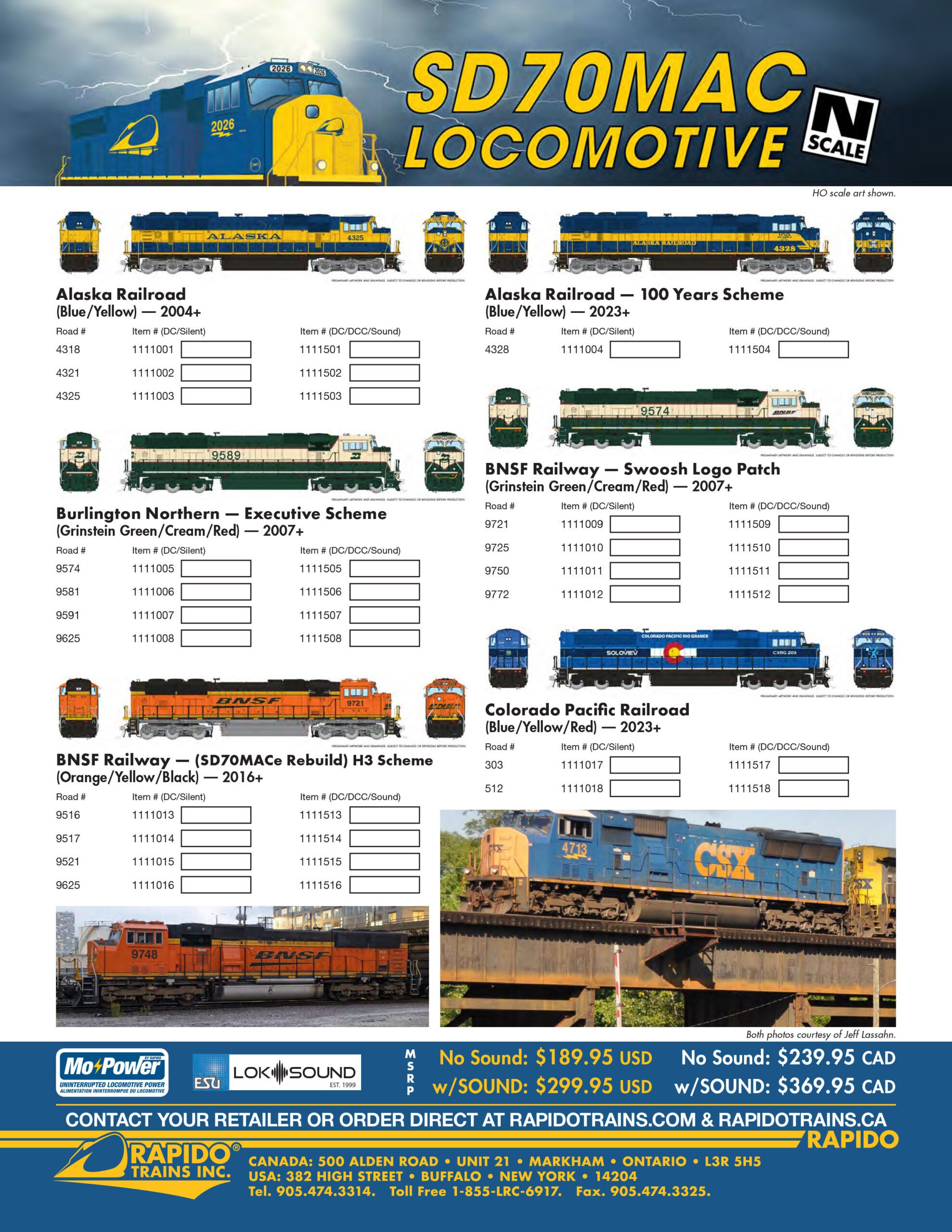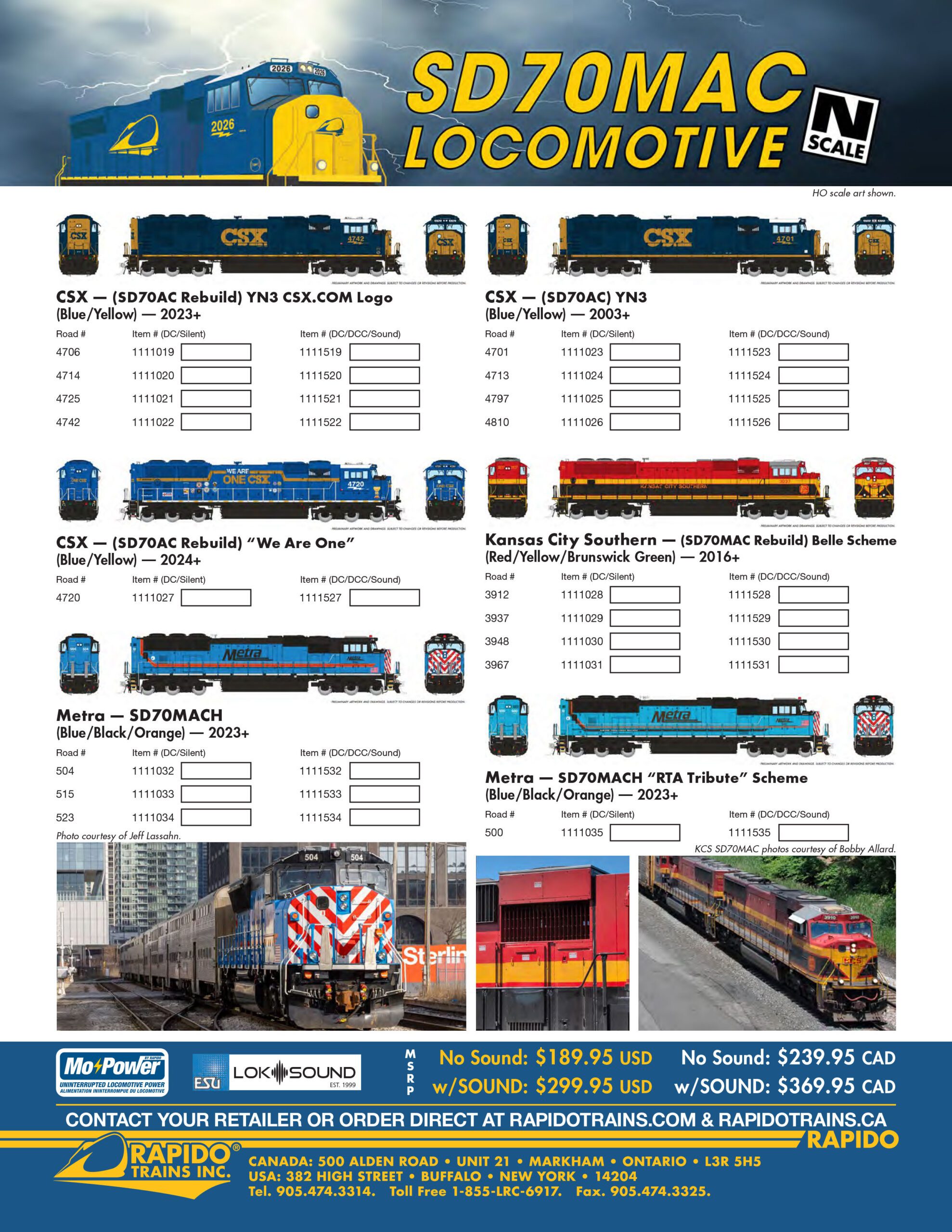 Rapido SD70MAC Locomotives Order Now Place Your Pre-Order Here * indicates required field Name:* Email:* Address:* City:* State:* Zip Code:* Phone Number:* Item Name & Manufacture:* Item Number(s) and Quantity:*